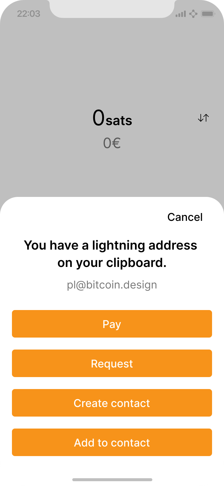 This scenario can be initiated by copying a lightning address to the clipboard, scanning a QR code, or tapping a payment link (see payment entry points). An address is passed into the application and, where it’s recognized and appropriate options are shown to the user. In the example below, the user adds the address as a new contact.