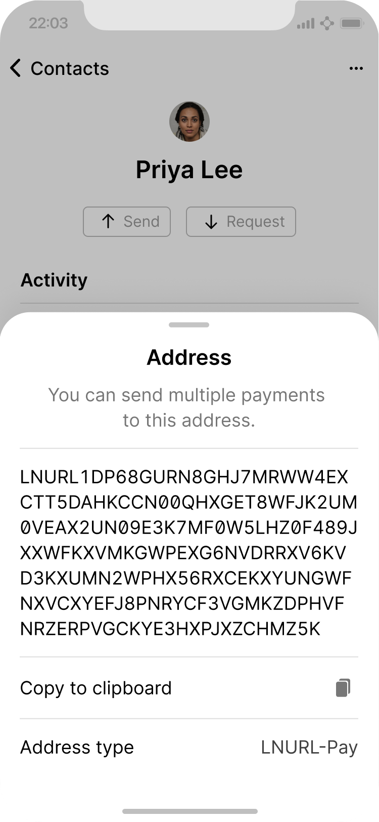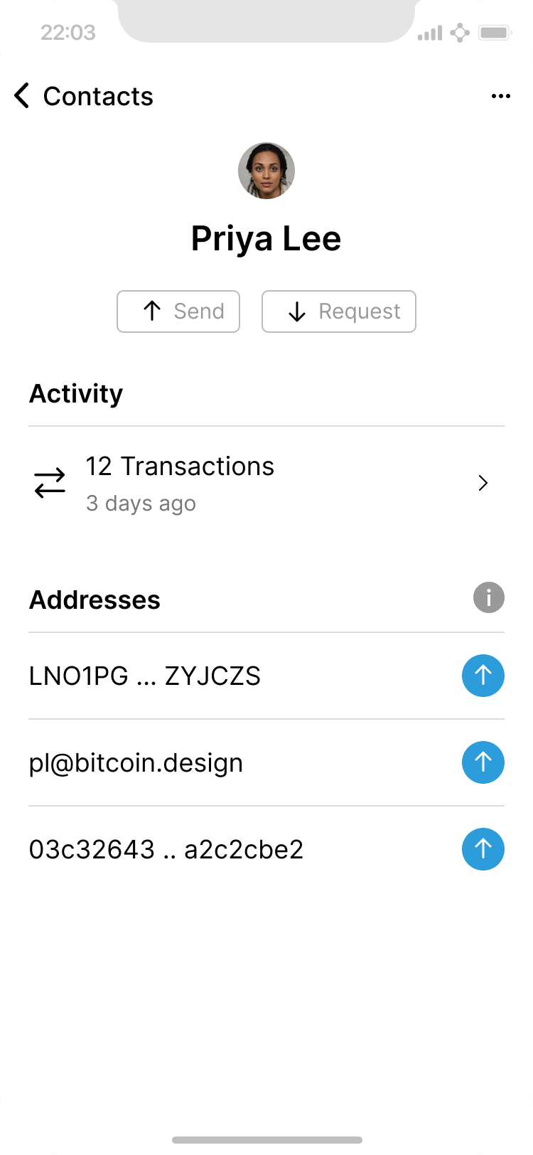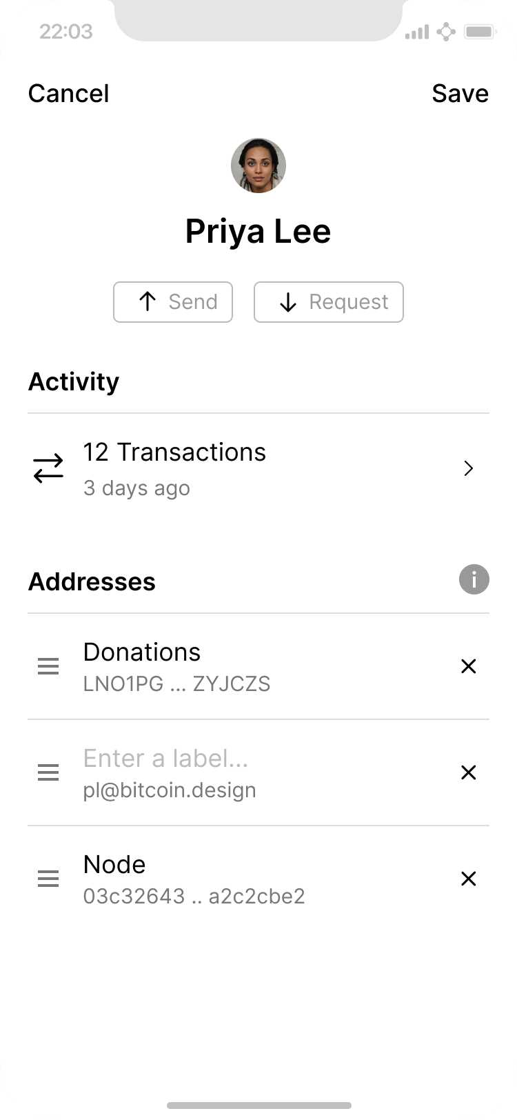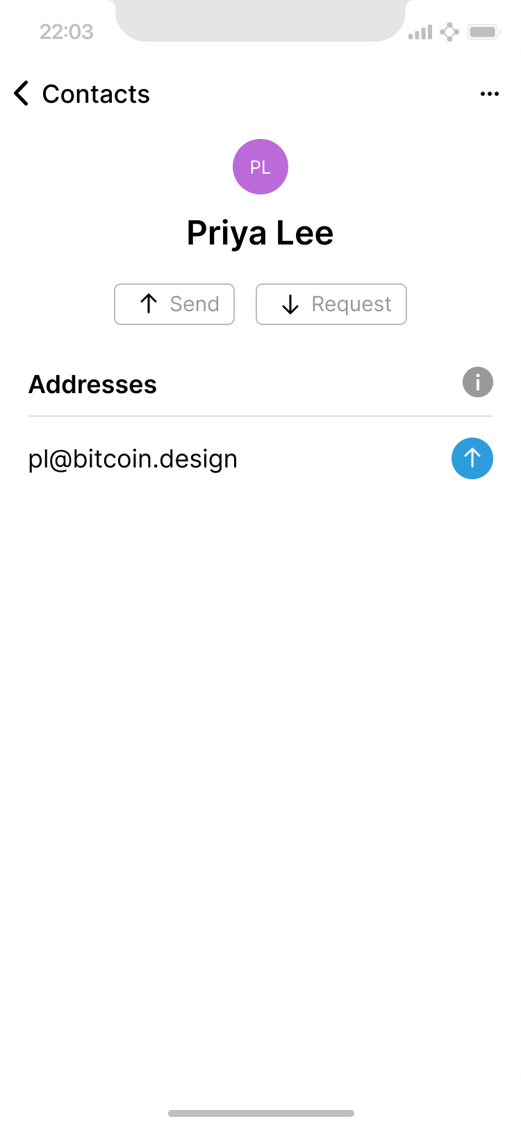 Invoices, node IDs and other transaction endpoints in bitcoin and lightning are highly unintuitive. Abstracting them via a contact list can create a much smoother user experience. There are many payment request formats, each with unique properties and varying levels of maturity and adoption, requiring unique design solutions. This page uses the more approachable term “address”, along with various UI techniques, to abstract these complexities for users.