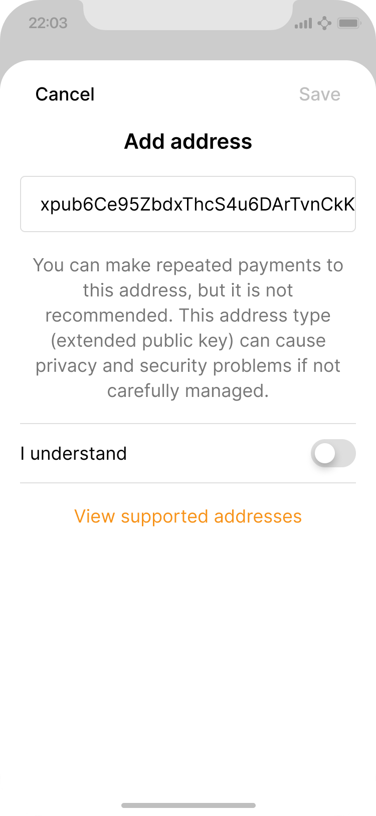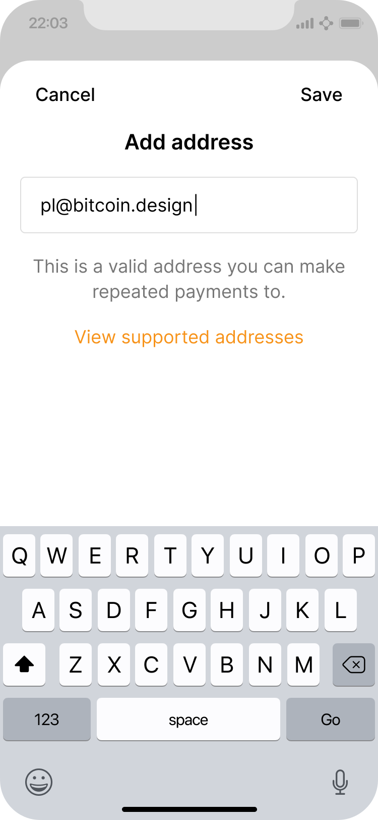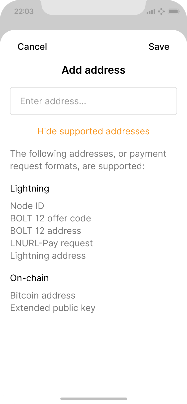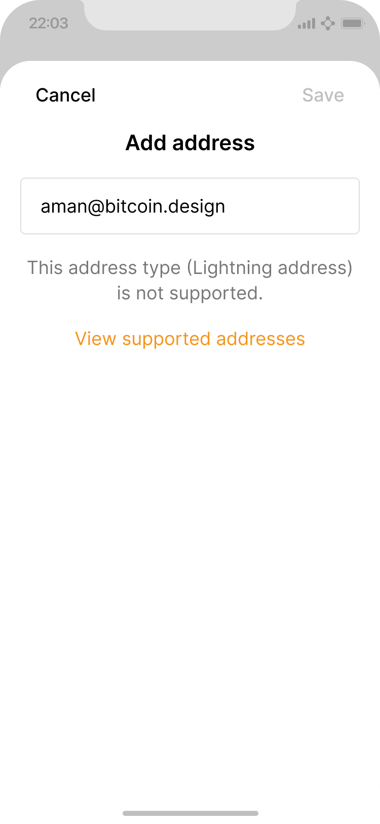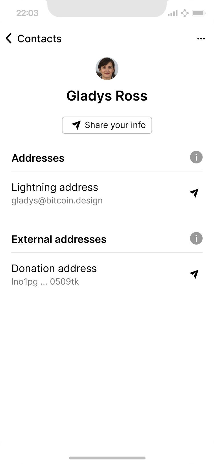 Invoices, node IDs and other transaction endpoints in bitcoin and lightning are highly unintuitive. Abstracting them via a contact list can create a much smoother user experience. There are many payment request formats, each with unique properties and varying levels of maturity and adoption, requiring unique design solutions. This page uses the more approachable term “address”, along with various UI techniques, to abstract these complexities for users.