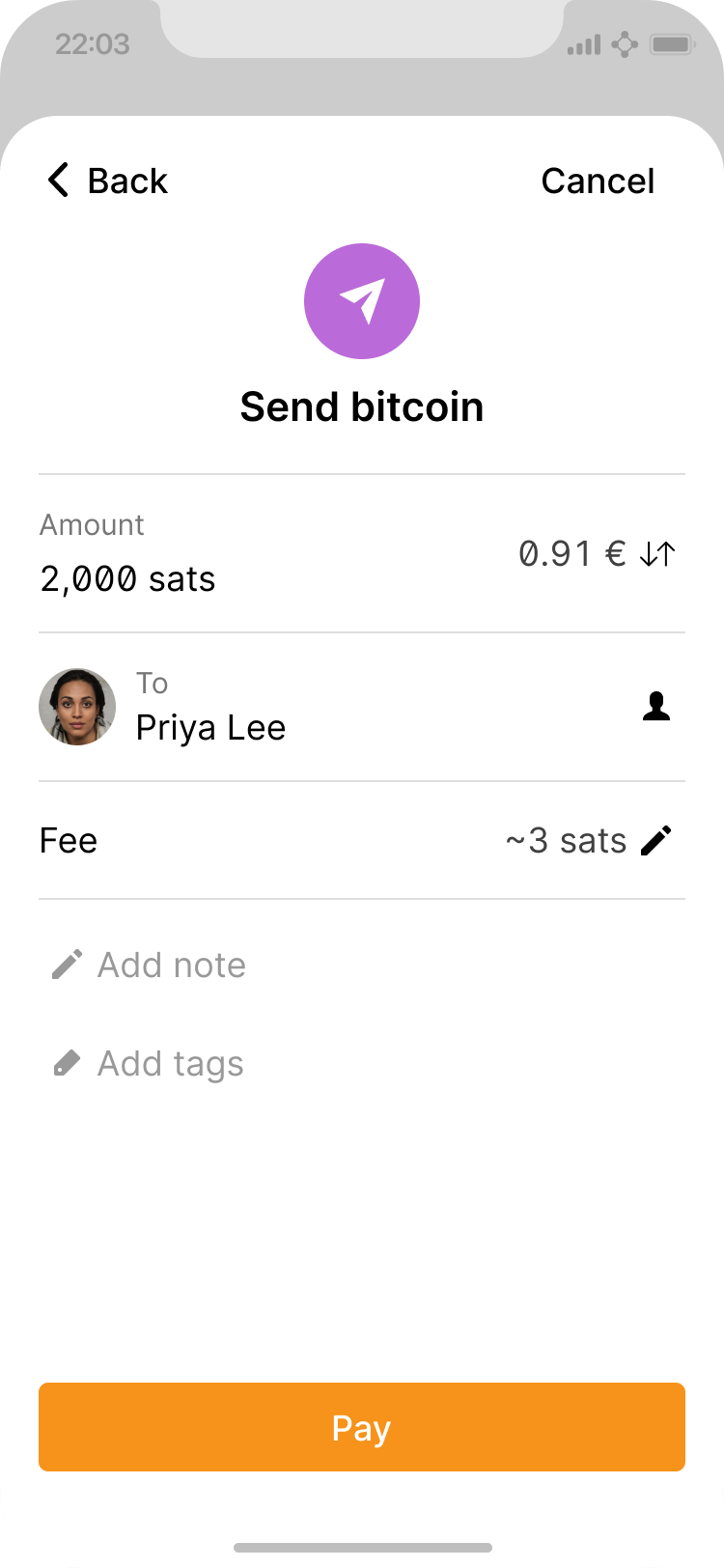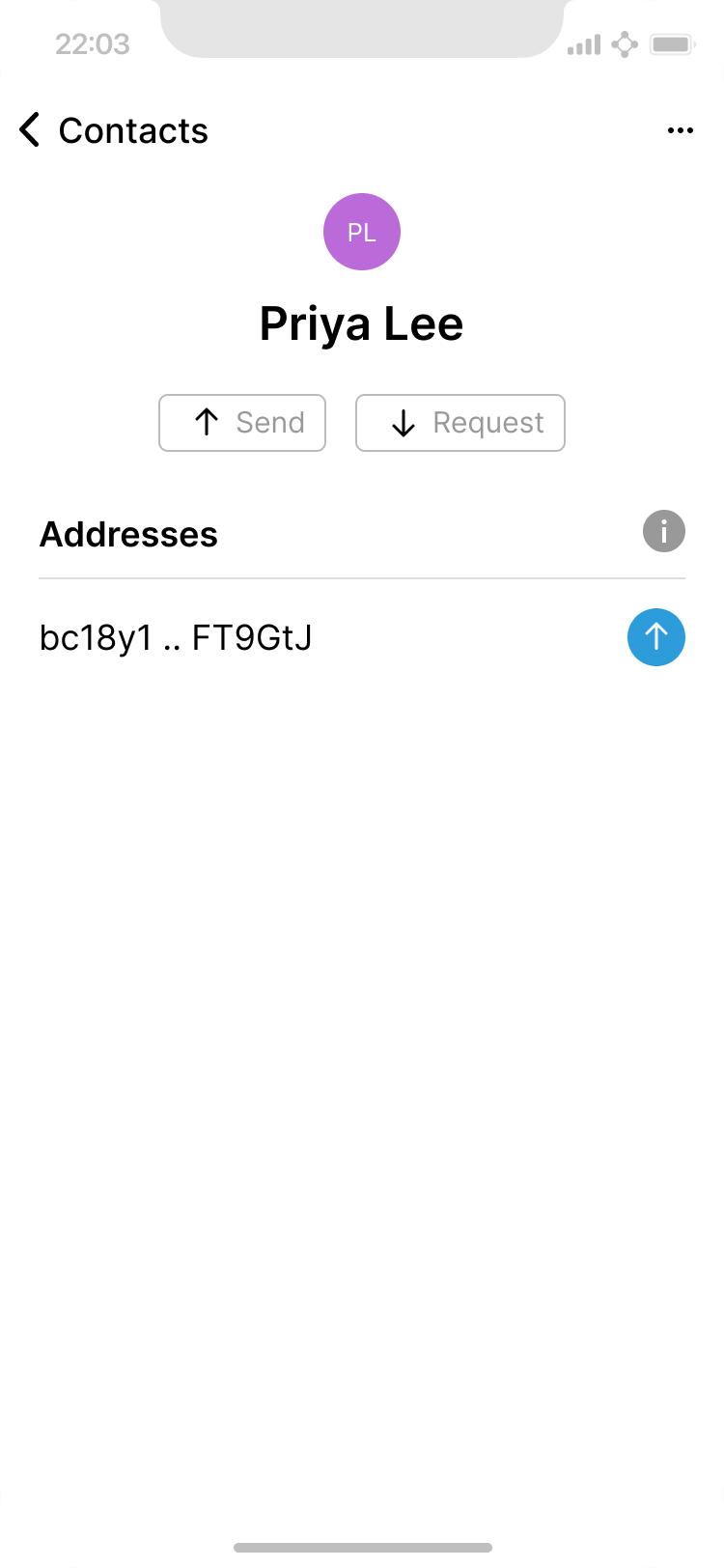 Initiating a payment can be as simple as entering an amount and tapping a contact that has a re-usable address associated. Otherwise, an extra step is needed to manually enter a destination address.