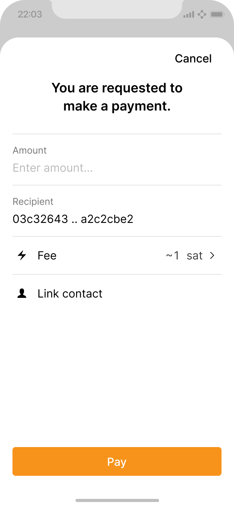 This sequence is similar to the one above. The difference is that a payment request was passed into the application, which contains different data and also includes a specific user action, and therefore requires different user flows. The one below shows how a user has scanned a payment request and assigns a contact to the payment.