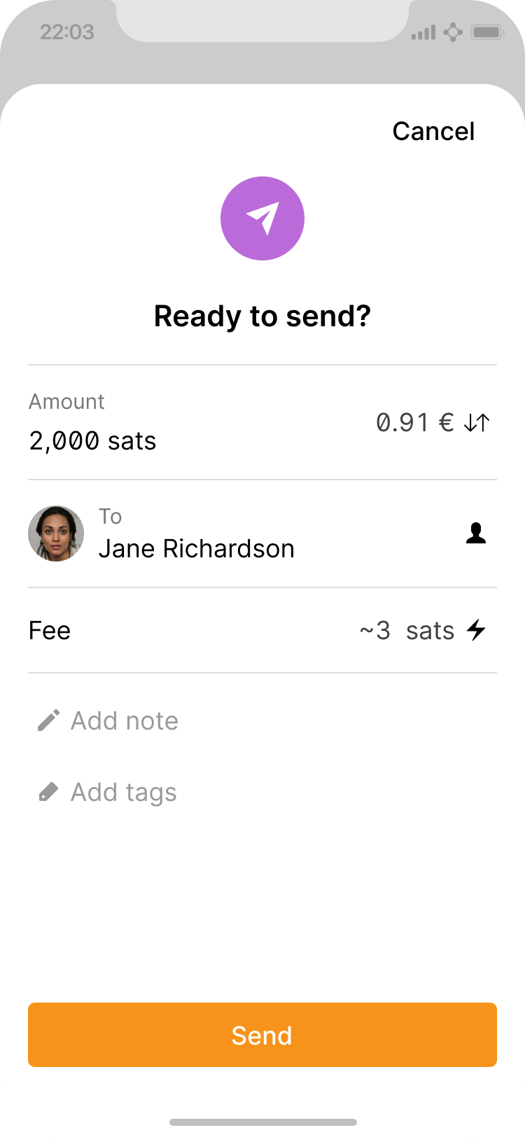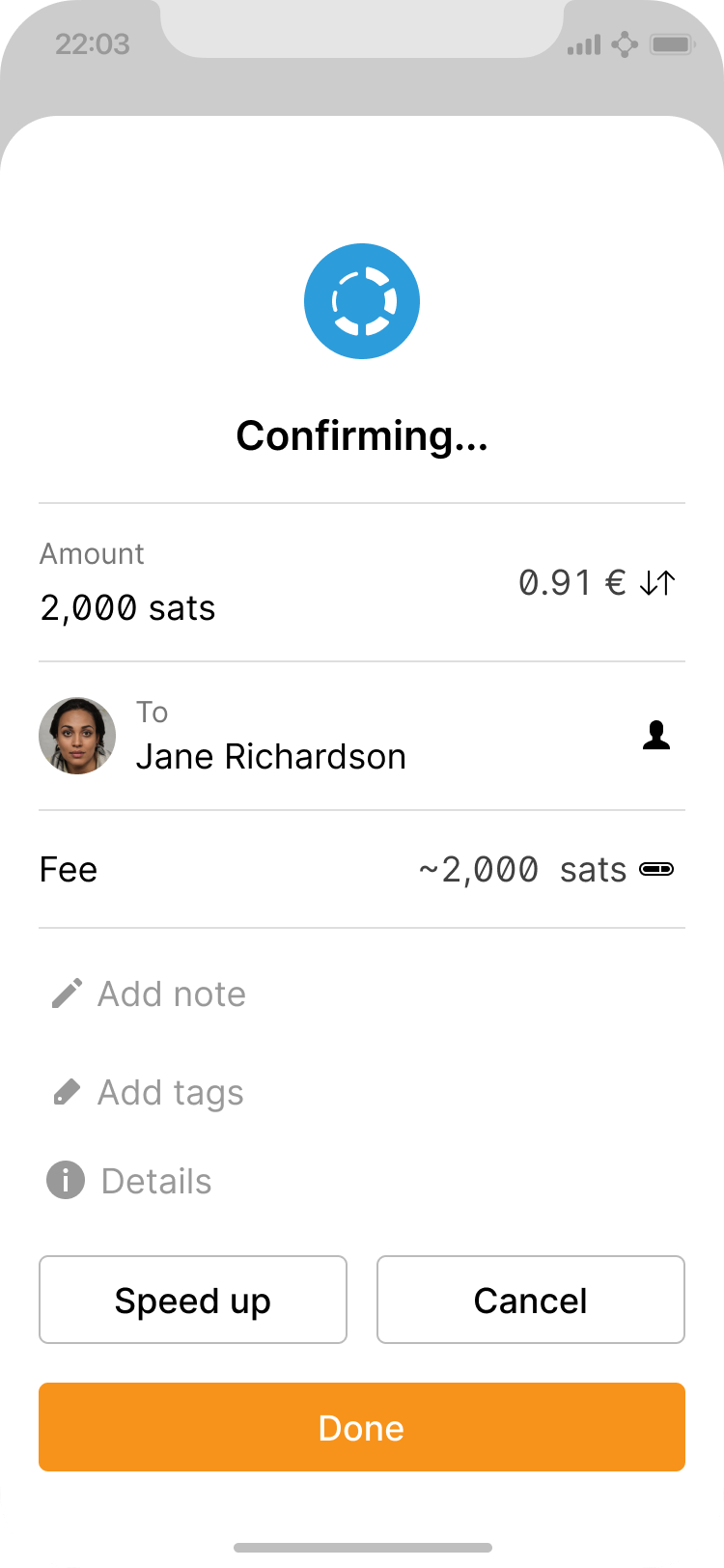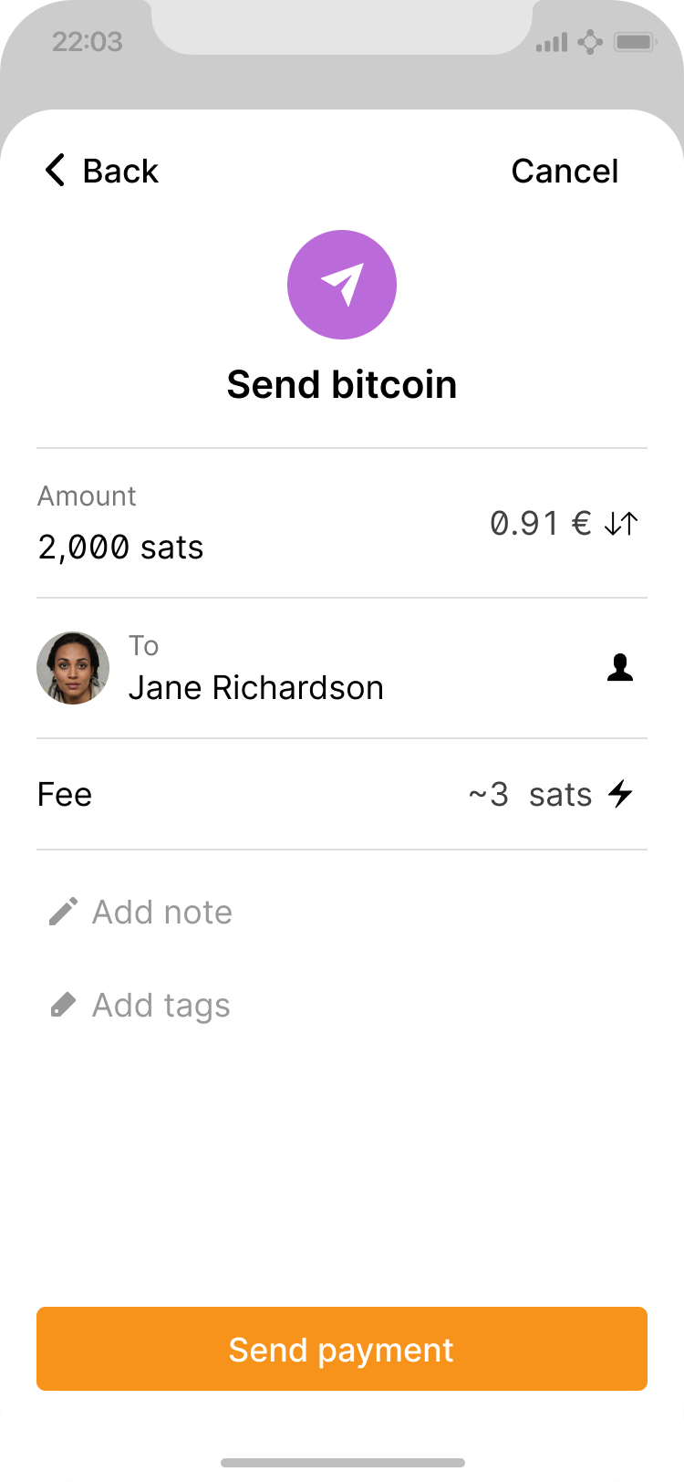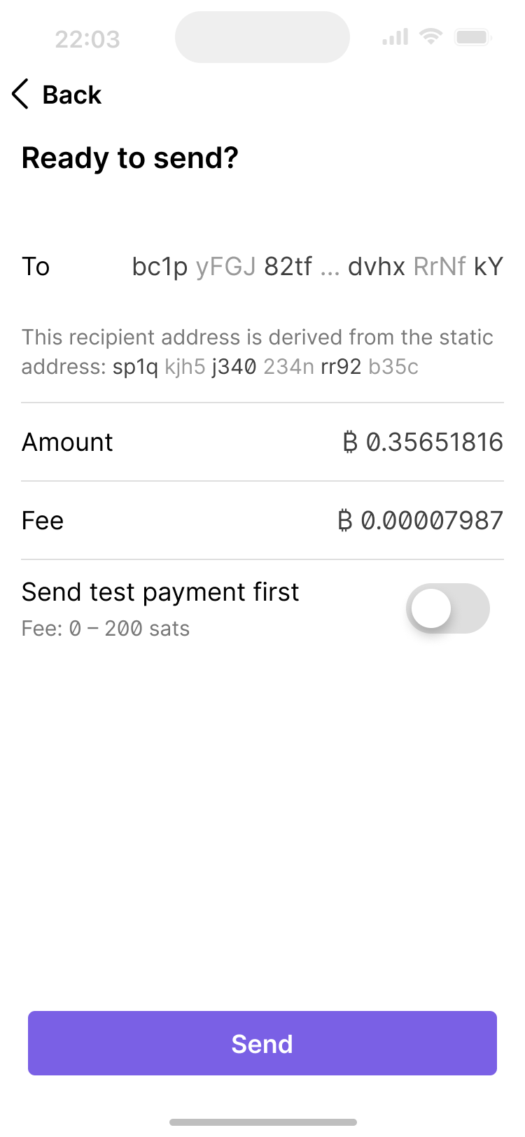 If no amount is provided via a payment request, manual entry should be simple and convenient so users don’t accidentally send an incorrect amount. The amount should be displayed in bitcoin or satoshi value, as well as the user’s local currency. Options to quickly toggle between them should be available. More on the Units & Symbols page.