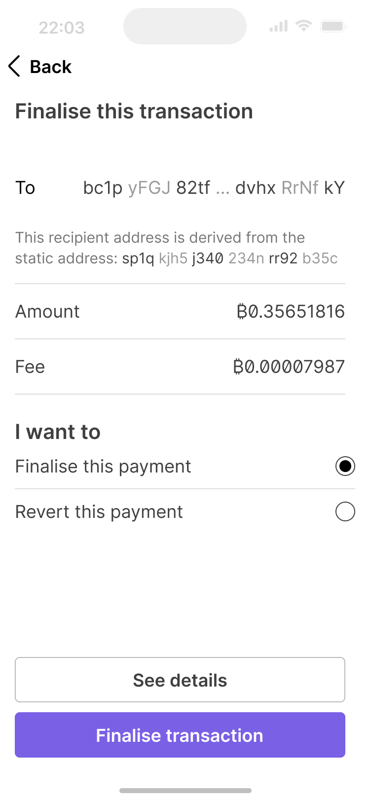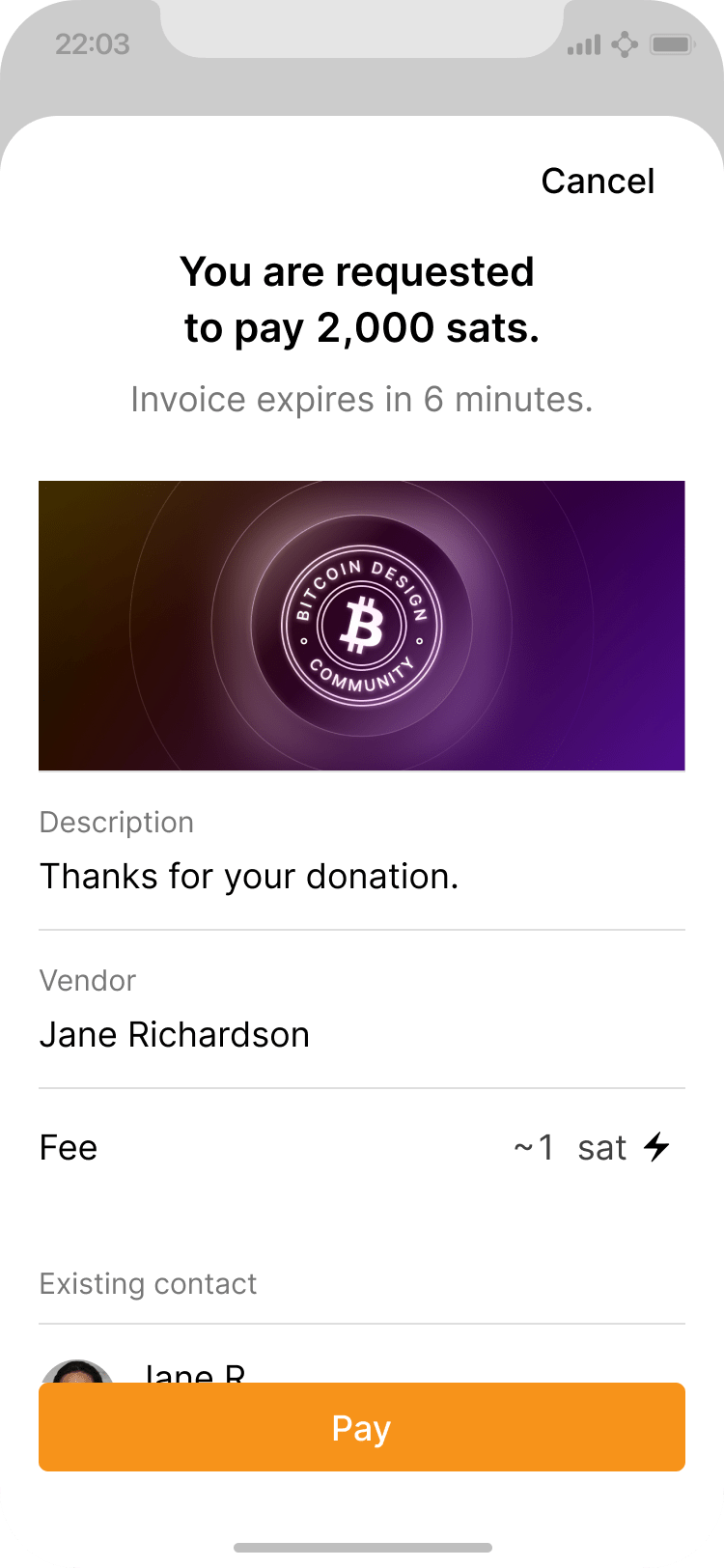 When a payment is initiated via an invoice or payment link and doesn’t require any additional input by the user, the whole user interaction is one of review and confirmation.