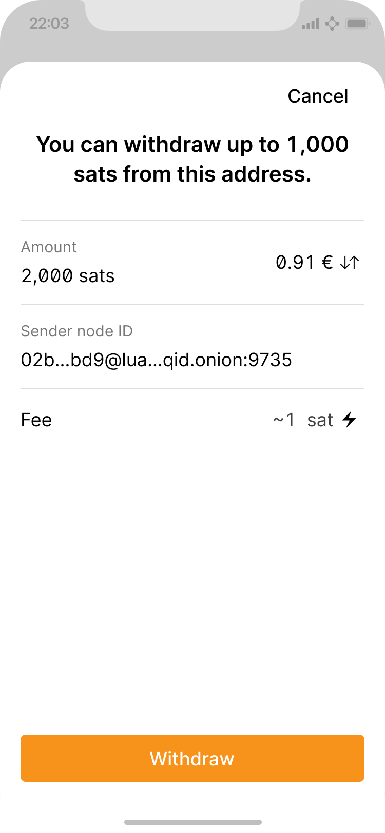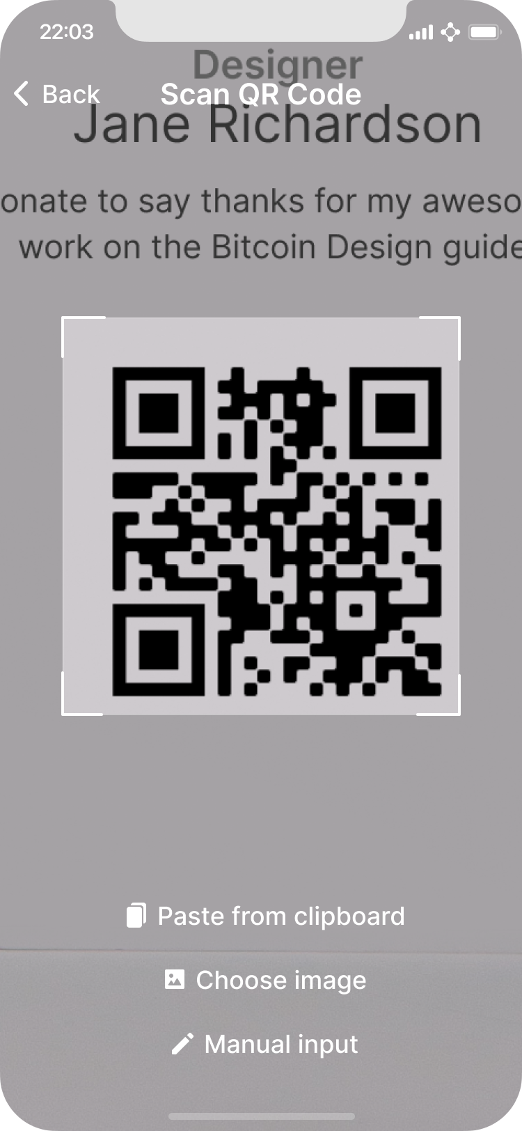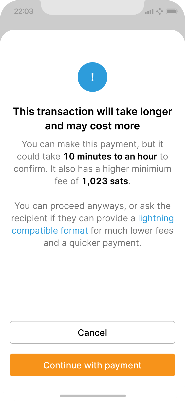 In this example, the user scans a QR to make a payment. This wallet recognizes it as an on-chain address. It is capable of making the on-chain payment with submarine swaps. However, that would involve a longer confirmation time and a higher fee for such a small payment. It immediately pulls up a modal notification to warn the user that they will have to wait longer for the payment to settle and pay a higher fee. It informs them they can pay instantly if they can get a different type of QR code from the sender.