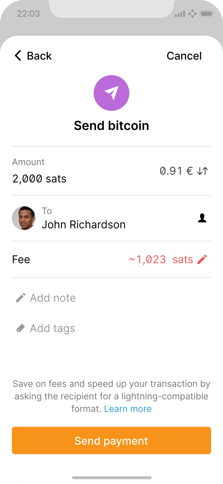The payment review screen draws attention to the higher on-chain fee and offers the user a way to save on fees and confirmation time.