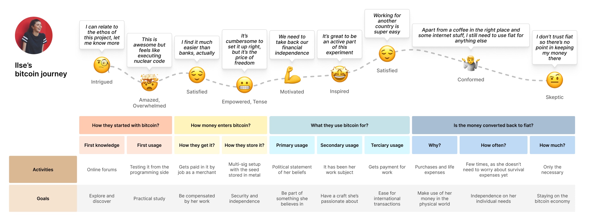 Patrícia Estevão developed several personas of bitcoin users based on 1-1 interview sessions. You can read about her full process here. These personas can be a great inspiration and foundation for your own work. Here we provide short summaries for you to get started with.