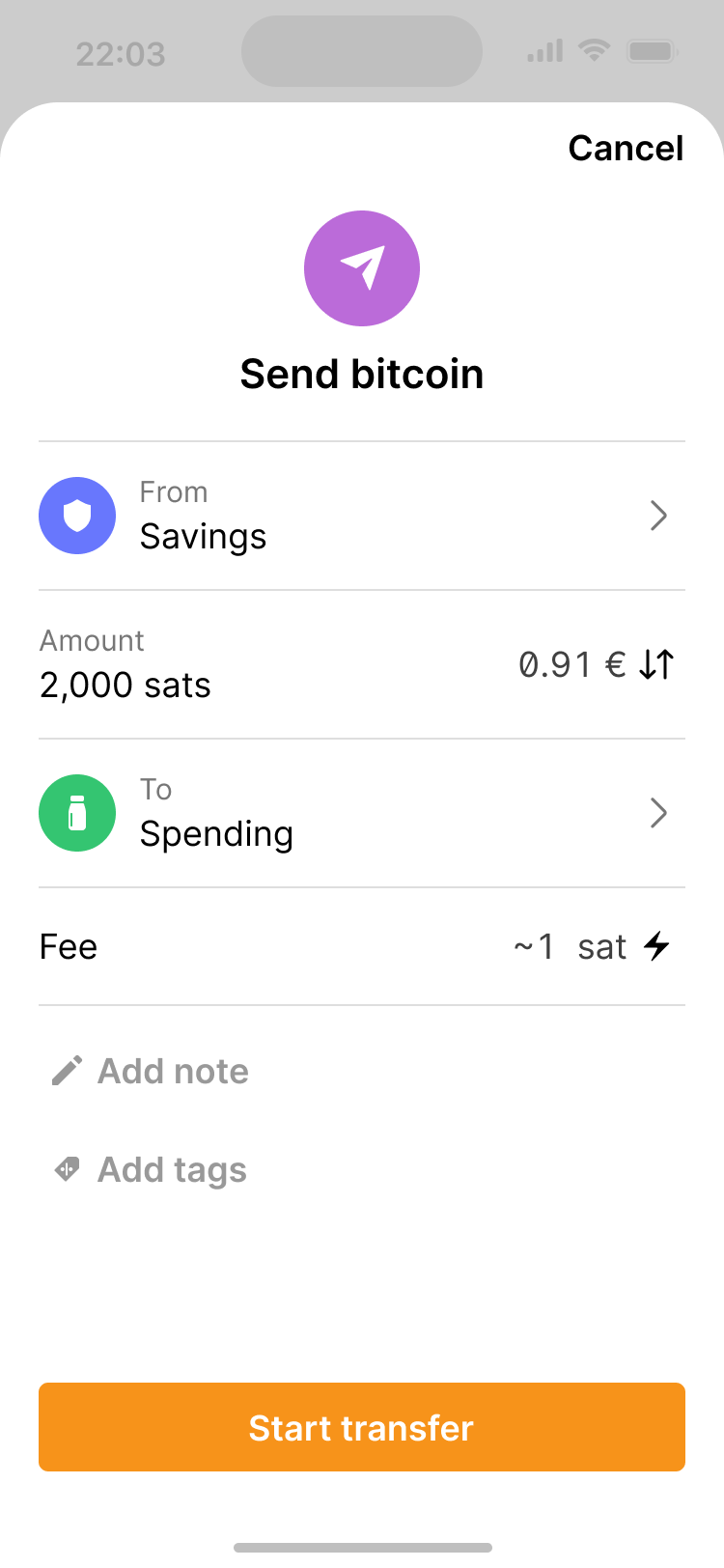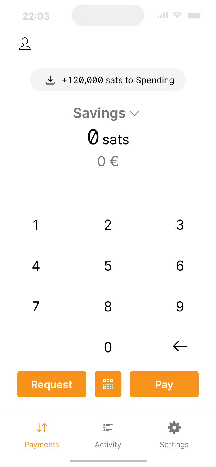Compared to the daily spending wallet, the only addition to the payments screen is an indicator for the currently selected wallet, right above the amount input. This indicator also functions as a button to expand the wallet switcher modal.