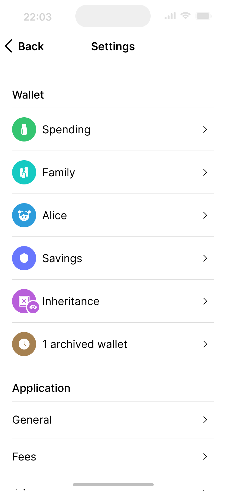 Because wallets are such primary organizational elements, a card format is sometimes chosen to give them a unique look that helps users recognize them even more quickly. Some applications also let users customize the appearance, which helps with recognition even more. It can also be appropriate to communicate wallet properties, like the layer and wallet type (single-key, multi-key, view-only…), if those are helpful to the user in the current context.